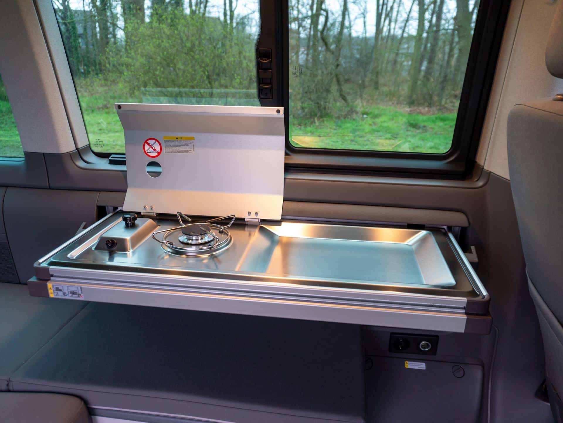 Campingtisch für Innen und Außen (in der Schiebetür) und zwei Klappstühle (in der Heckklappe)